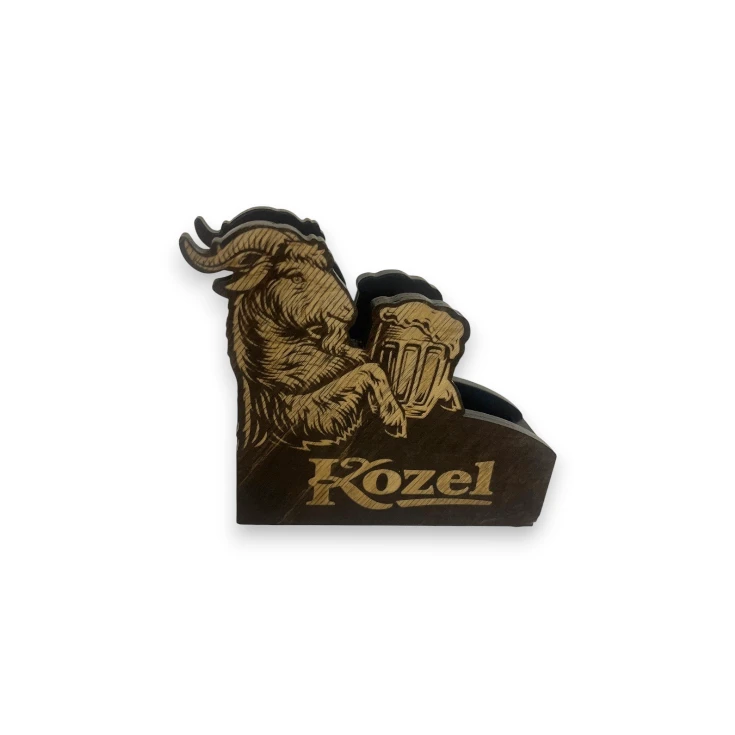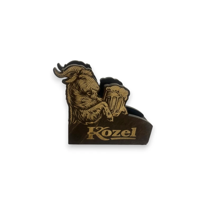 Ein stilvoller Holz-Untersetzerhalter mit dem ikonischen Kozel-Motiv ist das perfekte Accessoire für jeden Bierliebhaber. Die präzise Gravur der Marke Velkopopovický Kozel zieht sofort die Blicke auf sich und verleiht Ihrem Tisch originellen Charakter. Der Halte ist nicht nur dekorativ, sondern vor allem praktisch. Er hält Untersetzer ordentlich an einem Ort und Sie haben sie immer griffbereit. Dank der hochwertigen Holzverarbeitung passt er perfekt in Wohnung, Bar oder Ferienhaus und eignet sich auch hervorragend als Geschenk für jeden Fan von echtem tschechischem Bier.
